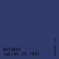 Цвет #313B6C в цветовой модели RGB обозначается тремя октетами (49, 59, 108) в десятичном формате и #313B6C в шестнадцатиричном (hex) формате, которые являются интенсивностью красного 49 (hex 31), интенсивность зелёного 59 (hex 3B) и интенсивность синего 108 (hex 6C).
