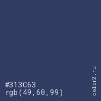 Цвет #313C63 в цветовой модели RGB обозначается тремя октетами (49, 60, 99) в десятичном формате и #313C63 в шестнадцатиричном (hex) формате, которые являются интенсивностью красного 49 (hex 31), интенсивность зелёного 60 (hex 3C) и интенсивность синего 99 (hex 63).
