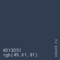 Цвет #313D51 в цветовой модели RGB обозначается тремя октетами (49, 61, 81) в десятичном формате и #313D51 в шестнадцатиричном (hex) формате, которые являются интенсивностью красного 49 (hex 31), интенсивность зелёного 61 (hex 3D) и интенсивность синего 81 (hex 51).