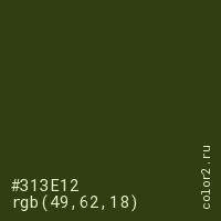 Цвет #313E12 в цветовой модели RGB обозначается тремя октетами (49, 62, 18) в десятичном формате и #313E12 в шестнадцатиричном (hex) формате, которые являются интенсивностью красного 49 (hex 31), интенсивность зелёного 62 (hex 3E) и интенсивность синего 18 (hex 12).