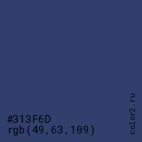 Цвет #313F6D в цветовой модели RGB обозначается тремя октетами (49, 63, 109) в десятичном формате и #313F6D в шестнадцатиричном (hex) формате, которые являются интенсивностью красного 49 (hex 31), интенсивность зелёного 63 (hex 3F) и интенсивность синего 109 (hex 6D).