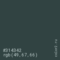 Цвет #314342 в цветовой модели RGB обозначается тремя октетами (49, 67, 66) в десятичном формате и #314342 в шестнадцатиричном (hex) формате, которые являются интенсивностью красного 49 (hex 31), интенсивность зелёного 67 (hex 43) и интенсивность синего 66 (hex 42).