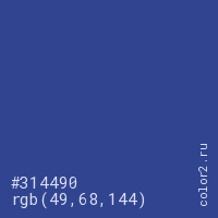 Цвет #314490 в цветовой модели RGB обозначается тремя октетами (49, 68, 144) в десятичном формате и #314490 в шестнадцатиричном (hex) формате, которые являются интенсивностью красного 49 (hex 31), интенсивность зелёного 68 (hex 44) и интенсивность синего 144 (hex 90).