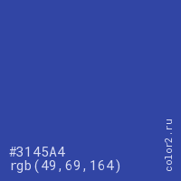 Цвет #3145A4 в цветовой модели RGB обозначается тремя октетами (49, 69, 164) в десятичном формате и #3145A4 в шестнадцатиричном (hex) формате, которые являются интенсивностью красного 49 (hex 31), интенсивность зелёного 69 (hex 45) и интенсивность синего 164 (hex A4).