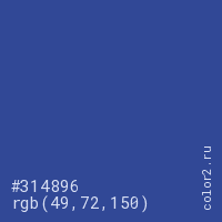 Цвет #314896 в цветовой модели RGB обозначается тремя октетами (49, 72, 150) в десятичном формате и #314896 в шестнадцатиричном (hex) формате, которые являются интенсивностью красного 49 (hex 31), интенсивность зелёного 72 (hex 48) и интенсивность синего 150 (hex 96).