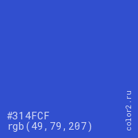 Цвет #314FCF в цветовой модели RGB обозначается тремя октетами (49, 79, 207) в десятичном формате и #314FCF в шестнадцатиричном (hex) формате, которые являются интенсивностью красного 49 (hex 31), интенсивность зелёного 79 (hex 4F) и интенсивность синего 207 (hex CF).