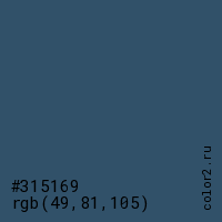 Цвет #315169 в цветовой модели RGB обозначается тремя октетами (49, 81, 105) в десятичном формате и #315169 в шестнадцатиричном (hex) формате, которые являются интенсивностью красного 49 (hex 31), интенсивность зелёного 81 (hex 51) и интенсивность синего 105 (hex 69).