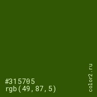 Цвет #315705 в цветовой модели RGB обозначается тремя октетами (49, 87, 5) в десятичном формате и #315705 в шестнадцатиричном (hex) формате, которые являются интенсивностью красного 49 (hex 31), интенсивность зелёного 87 (hex 57) и интенсивность синего 5 (hex 05).