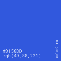 Цвет #3158DD в цветовой модели RGB обозначается тремя октетами (49, 88, 221) в десятичном формате и #3158DD в шестнадцатиричном (hex) формате, которые являются интенсивностью красного 49 (hex 31), интенсивность зелёного 88 (hex 58) и интенсивность синего 221 (hex DD).