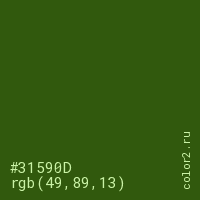 Цвет #31590D в цветовой модели RGB обозначается тремя октетами (49, 89, 13) в десятичном формате и #31590D в шестнадцатиричном (hex) формате, которые являются интенсивностью красного 49 (hex 31), интенсивность зелёного 89 (hex 59) и интенсивность синего 13 (hex 0D).