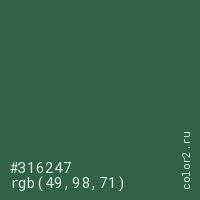 Цвет #316247 в цветовой модели RGB обозначается тремя октетами (49, 98, 71) в десятичном формате и #316247 в шестнадцатиричном (hex) формате, которые являются интенсивностью красного 49 (hex 31), интенсивность зелёного 98 (hex 62) и интенсивность синего 71 (hex 47).