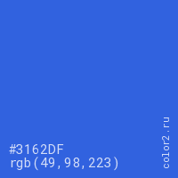 Цвет #3162DF в цветовой модели RGB обозначается тремя октетами (49, 98, 223) в десятичном формате и #3162DF в шестнадцатиричном (hex) формате, которые являются интенсивностью красного 49 (hex 31), интенсивность зелёного 98 (hex 62) и интенсивность синего 223 (hex DF).