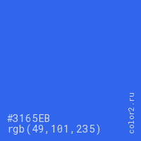 Цвет #3165EB в цветовой модели RGB обозначается тремя октетами (49, 101, 235) в десятичном формате и #3165EB в шестнадцатиричном (hex) формате, которые являются интенсивностью красного 49 (hex 31), интенсивность зелёного 101 (hex 65) и интенсивность синего 235 (hex EB).