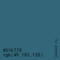 Цвет #316778 в цветовой модели RGB обозначается тремя октетами (49, 103, 120) в десятичном формате и #316778 в шестнадцатиричном (hex) формате, которые являются интенсивностью красного 49 (hex 31), интенсивность зелёного 103 (hex 67) и интенсивность синего 120 (hex 78).