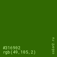 Цвет #316902 в цветовой модели RGB обозначается тремя октетами (49, 105, 2) в десятичном формате и #316902 в шестнадцатиричном (hex) формате, которые являются интенсивностью красного 49 (hex 31), интенсивность зелёного 105 (hex 69) и интенсивность синего 2 (hex 02).