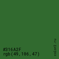 Цвет #316A2F в цветовой модели RGB обозначается тремя октетами (49, 106, 47) в десятичном формате и #316A2F в шестнадцатиричном (hex) формате, которые являются интенсивностью красного 49 (hex 31), интенсивность зелёного 106 (hex 6A) и интенсивность синего 47 (hex 2F).