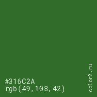 Цвет #316C2A в цветовой модели RGB обозначается тремя октетами (49, 108, 42) в десятичном формате и #316C2A в шестнадцатиричном (hex) формате, которые являются интенсивностью красного 49 (hex 31), интенсивность зелёного 108 (hex 6C) и интенсивность синего 42 (hex 2A).