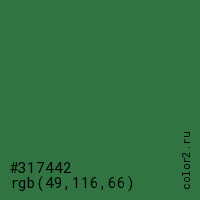 Цвет #317442 в цветовой модели RGB обозначается тремя октетами (49, 116, 66) в десятичном формате и #317442 в шестнадцатиричном (hex) формате, которые являются интенсивностью красного 49 (hex 31), интенсивность зелёного 116 (hex 74) и интенсивность синего 66 (hex 42).