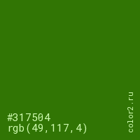 Цвет #317504 в цветовой модели RGB обозначается тремя октетами (49, 117, 4) в десятичном формате и #317504 в шестнадцатиричном (hex) формате, которые являются интенсивностью красного 49 (hex 31), интенсивность зелёного 117 (hex 75) и интенсивность синего 4 (hex 04).