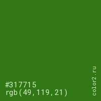 Цвет #317715 в цветовой модели RGB обозначается тремя октетами (49, 119, 21) в десятичном формате и #317715 в шестнадцатиричном (hex) формате, которые являются интенсивностью красного 49 (hex 31), интенсивность зелёного 119 (hex 77) и интенсивность синего 21 (hex 15).