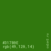 Цвет #31780E в цветовой модели RGB обозначается тремя октетами (49, 120, 14) в десятичном формате и #31780E в шестнадцатиричном (hex) формате, которые являются интенсивностью красного 49 (hex 31), интенсивность зелёного 120 (hex 78) и интенсивность синего 14 (hex 0E).