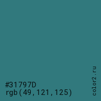 Цвет #31797D в цветовой модели RGB обозначается тремя октетами (49, 121, 125) в десятичном формате и #31797D в шестнадцатиричном (hex) формате, которые являются интенсивностью красного 49 (hex 31), интенсивность зелёного 121 (hex 79) и интенсивность синего 125 (hex 7D).