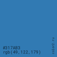Цвет #317AB3 в цветовой модели RGB обозначается тремя октетами (49, 122, 179) в десятичном формате и #317AB3 в шестнадцатиричном (hex) формате, которые являются интенсивностью красного 49 (hex 31), интенсивность зелёного 122 (hex 7A) и интенсивность синего 179 (hex B3).