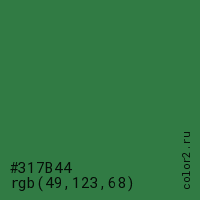 Цвет #317B44 в цветовой модели RGB обозначается тремя октетами (49, 123, 68) в десятичном формате и #317B44 в шестнадцатиричном (hex) формате, которые являются интенсивностью красного 49 (hex 31), интенсивность зелёного 123 (hex 7B) и интенсивность синего 68 (hex 44).