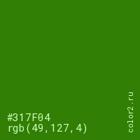 Цвет #317F04 в цветовой модели RGB обозначается тремя октетами (49, 127, 4) в десятичном формате и #317F04 в шестнадцатиричном (hex) формате, которые являются интенсивностью красного 49 (hex 31), интенсивность зелёного 127 (hex 7F) и интенсивность синего 4 (hex 04).