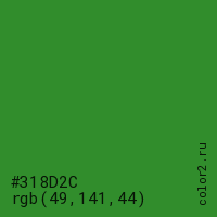 Цвет #318D2C в цветовой модели RGB обозначается тремя октетами (49, 141, 44) в десятичном формате и #318D2C в шестнадцатиричном (hex) формате, которые являются интенсивностью красного 49 (hex 31), интенсивность зелёного 141 (hex 8D) и интенсивность синего 44 (hex 2C).