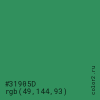 Цвет #31905D в цветовой модели RGB обозначается тремя октетами (49, 144, 93) в десятичном формате и #31905D в шестнадцатиричном (hex) формате, которые являются интенсивностью красного 49 (hex 31), интенсивность зелёного 144 (hex 90) и интенсивность синего 93 (hex 5D).