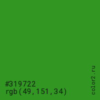 Цвет #319722 в цветовой модели RGB обозначается тремя октетами (49, 151, 34) в десятичном формате и #319722 в шестнадцатиричном (hex) формате, которые являются интенсивностью красного 49 (hex 31), интенсивность зелёного 151 (hex 97) и интенсивность синего 34 (hex 22).