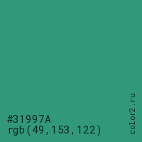 Цвет #31997A в цветовой модели RGB обозначается тремя октетами (49, 153, 122) в десятичном формате и #31997A в шестнадцатиричном (hex) формате, которые являются интенсивностью красного 49 (hex 31), интенсивность зелёного 153 (hex 99) и интенсивность синего 122 (hex 7A).