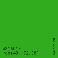 Цвет #31AC1E в цветовой модели RGB обозначается тремя октетами (49, 172, 30) в десятичном формате и #31AC1E в шестнадцатиричном (hex) формате, которые являются интенсивностью красного 49 (hex 31), интенсивность зелёного 172 (hex AC) и интенсивность синего 30 (hex 1E).