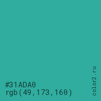Цвет #31ADA0 в цветовой модели RGB обозначается тремя октетами (49, 173, 160) в десятичном формате и #31ADA0 в шестнадцатиричном (hex) формате, которые являются интенсивностью красного 49 (hex 31), интенсивность зелёного 173 (hex AD) и интенсивность синего 160 (hex A0).