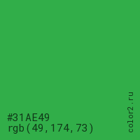 Цвет #31AE49 в цветовой модели RGB обозначается тремя октетами (49, 174, 73) в десятичном формате и #31AE49 в шестнадцатиричном (hex) формате, которые являются интенсивностью красного 49 (hex 31), интенсивность зелёного 174 (hex AE) и интенсивность синего 73 (hex 49).