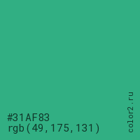 Цвет #31AF83 в цветовой модели RGB обозначается тремя октетами (49, 175, 131) в десятичном формате и #31AF83 в шестнадцатиричном (hex) формате, которые являются интенсивностью красного 49 (hex 31), интенсивность зелёного 175 (hex AF) и интенсивность синего 131 (hex 83).