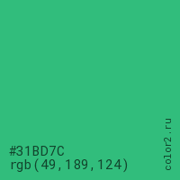 Цвет #31BD7C в цветовой модели RGB обозначается тремя октетами (49, 189, 124) в десятичном формате и #31BD7C в шестнадцатиричном (hex) формате, которые являются интенсивностью красного 49 (hex 31), интенсивность зелёного 189 (hex BD) и интенсивность синего 124 (hex 7C).
