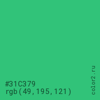 Цвет #31C379 в цветовой модели RGB обозначается тремя октетами (49, 195, 121) в десятичном формате и #31C379 в шестнадцатиричном (hex) формате, которые являются интенсивностью красного 49 (hex 31), интенсивность зелёного 195 (hex C3) и интенсивность синего 121 (hex 79).