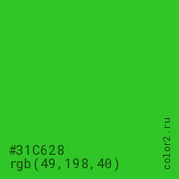 Цвет #31C628 в цветовой модели RGB обозначается тремя октетами (49, 198, 40) в десятичном формате и #31C628 в шестнадцатиричном (hex) формате, которые являются интенсивностью красного 49 (hex 31), интенсивность зелёного 198 (hex C6) и интенсивность синего 40 (hex 28).