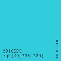 Цвет #31CDDC в цветовой модели RGB обозначается тремя октетами (49, 205, 220) в десятичном формате и #31CDDC в шестнадцатиричном (hex) формате, которые являются интенсивностью красного 49 (hex 31), интенсивность зелёного 205 (hex CD) и интенсивность синего 220 (hex DC).