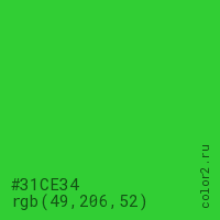 Цвет #31CE34 в цветовой модели RGB обозначается тремя октетами (49, 206, 52) в десятичном формате и #31CE34 в шестнадцатиричном (hex) формате, которые являются интенсивностью красного 49 (hex 31), интенсивность зелёного 206 (hex CE) и интенсивность синего 52 (hex 34).