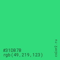 Цвет #31DB7B в цветовой модели RGB обозначается тремя октетами (49, 219, 123) в десятичном формате и #31DB7B в шестнадцатиричном (hex) формате, которые являются интенсивностью красного 49 (hex 31), интенсивность зелёного 219 (hex DB) и интенсивность синего 123 (hex 7B).