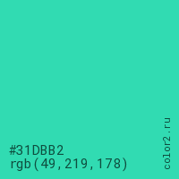 Цвет #31DBB2 в цветовой модели RGB обозначается тремя октетами (49, 219, 178) в десятичном формате и #31DBB2 в шестнадцатиричном (hex) формате, которые являются интенсивностью красного 49 (hex 31), интенсивность зелёного 219 (hex DB) и интенсивность синего 178 (hex B2).
