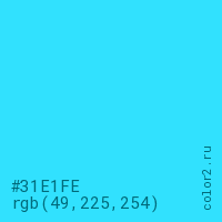 Цвет #31E1FE в цветовой модели RGB обозначается тремя октетами (49, 225, 254) в десятичном формате и #31E1FE в шестнадцатиричном (hex) формате, которые являются интенсивностью красного 49 (hex 31), интенсивность зелёного 225 (hex E1) и интенсивность синего 254 (hex FE).
