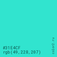 Цвет #31E4CF в цветовой модели RGB обозначается тремя октетами (49, 228, 207) в десятичном формате и #31E4CF в шестнадцатиричном (hex) формате, которые являются интенсивностью красного 49 (hex 31), интенсивность зелёного 228 (hex E4) и интенсивность синего 207 (hex CF).