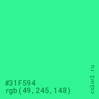 Цвет #31F594 в цветовой модели RGB обозначается тремя октетами (49, 245, 148) в десятичном формате и #31F594 в шестнадцатиричном (hex) формате, которые являются интенсивностью красного 49 (hex 31), интенсивность зелёного 245 (hex F5) и интенсивность синего 148 (hex 94).