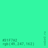 Цвет #31F7A2 в цветовой модели RGB обозначается тремя октетами (49, 247, 162) в десятичном формате и #31F7A2 в шестнадцатиричном (hex) формате, которые являются интенсивностью красного 49 (hex 31), интенсивность зелёного 247 (hex F7) и интенсивность синего 162 (hex A2).