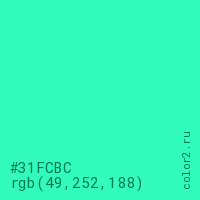 Цвет #31FCBC в цветовой модели RGB обозначается тремя октетами (49, 252, 188) в десятичном формате и #31FCBC в шестнадцатиричном (hex) формате, которые являются интенсивностью красного 49 (hex 31), интенсивность зелёного 252 (hex FC) и интенсивность синего 188 (hex BC).