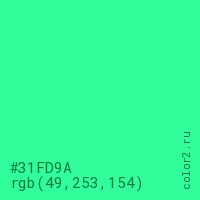 Цвет #31FD9A в цветовой модели RGB обозначается тремя октетами (49, 253, 154) в десятичном формате и #31FD9A в шестнадцатиричном (hex) формате, которые являются интенсивностью красного 49 (hex 31), интенсивность зелёного 253 (hex FD) и интенсивность синего 154 (hex 9A).